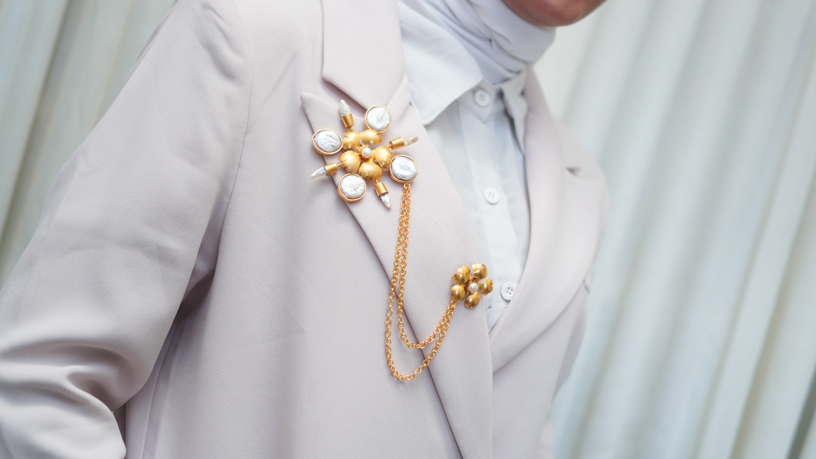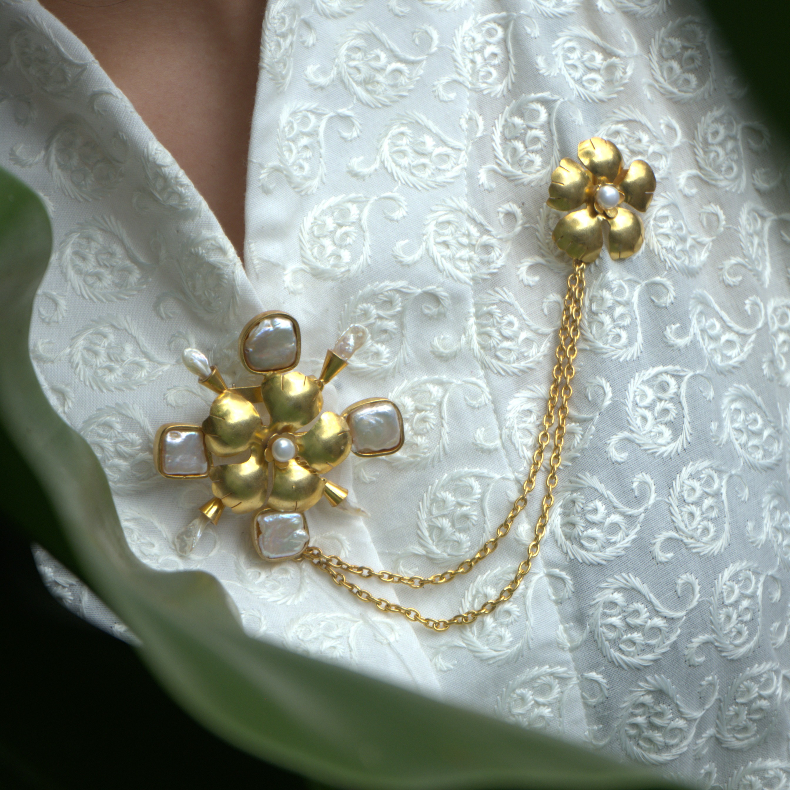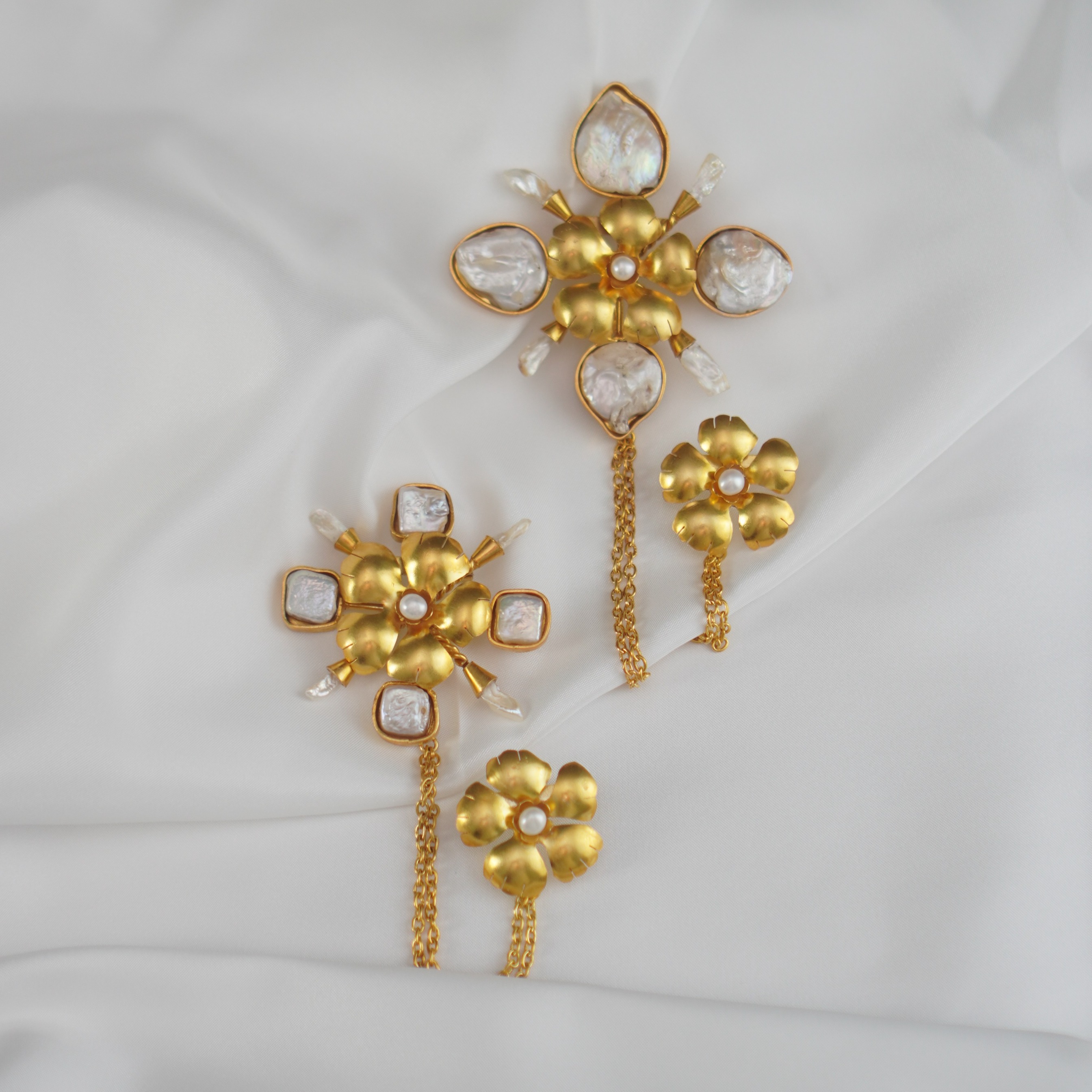 Terinspirasi dari bunga yang muncul dalam motif wastra khas Palembang, yaitu songket. Dilengkapi dengan mutiara barok yang memiiki keindahan unik