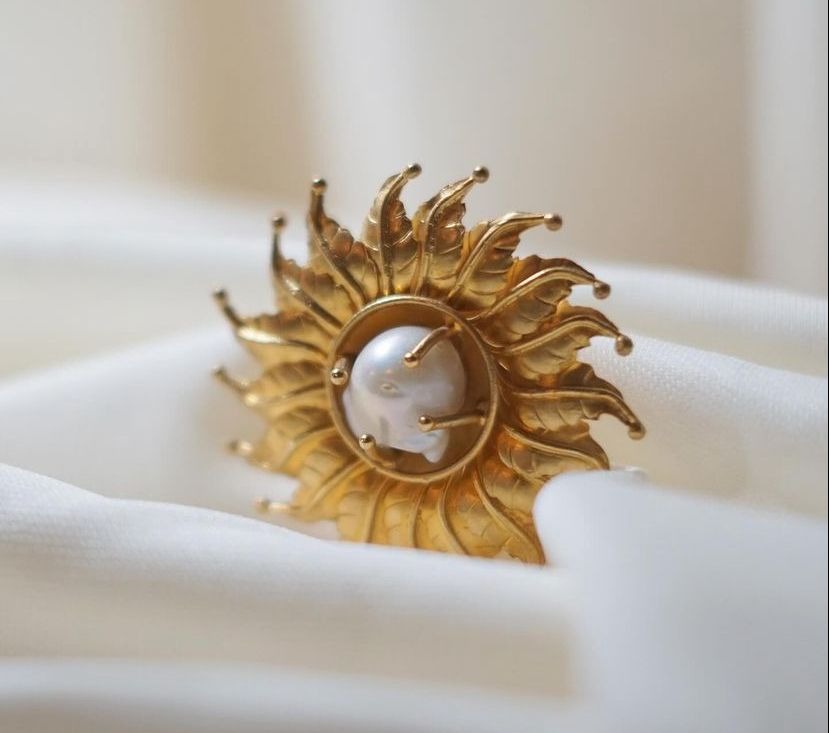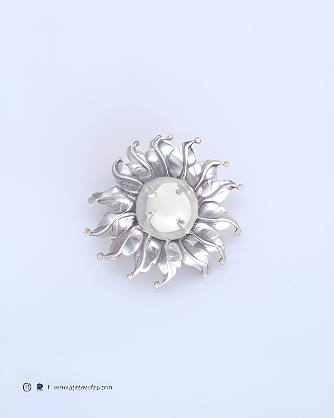 Mengambil bentuk floral dari matahari yang bersinar cerah menyambut pagi. Warna keemasan dan mutiara air tawar di tengahnya memberi kesan hangat yang lembut.