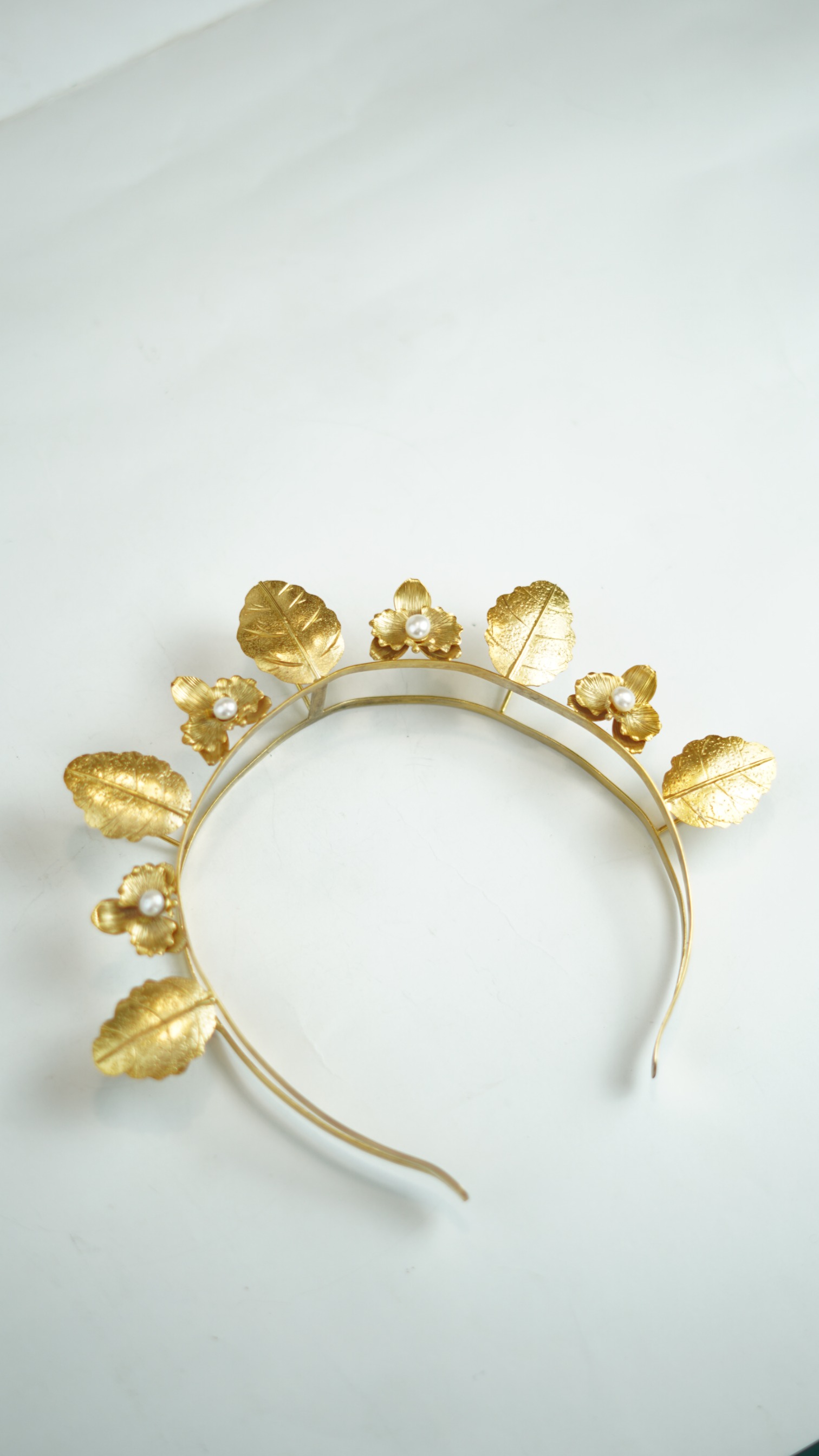 Bando yang dirangkai dari daun dan bunga anggrek kecil, memberi tampilan segar pada gaya untuk hiasan kepala