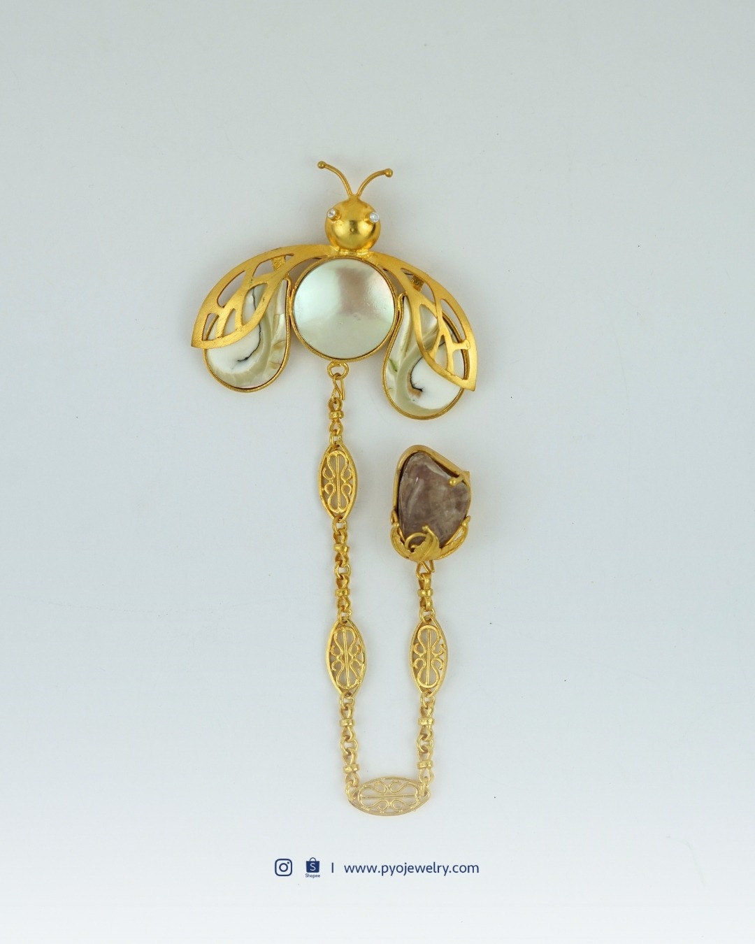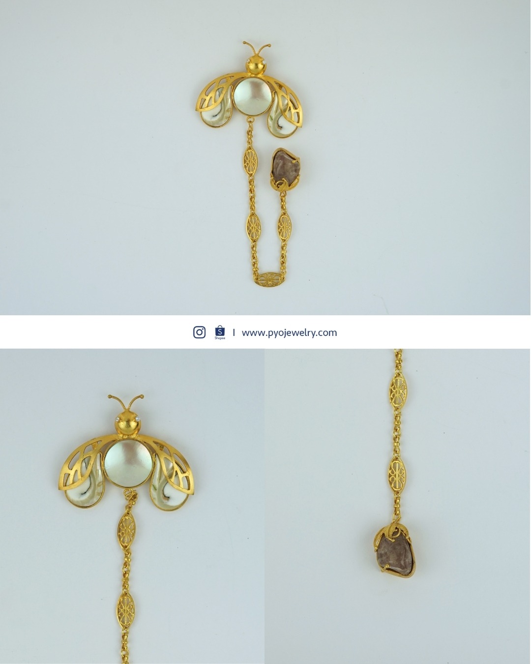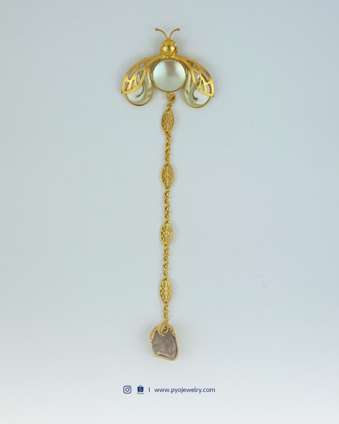 Mengambil bentuk kumbang pertanda perlindungan dan kegigihan, hadir dalam bentuk kerah dengan sentuhan barok dan kulit kerang